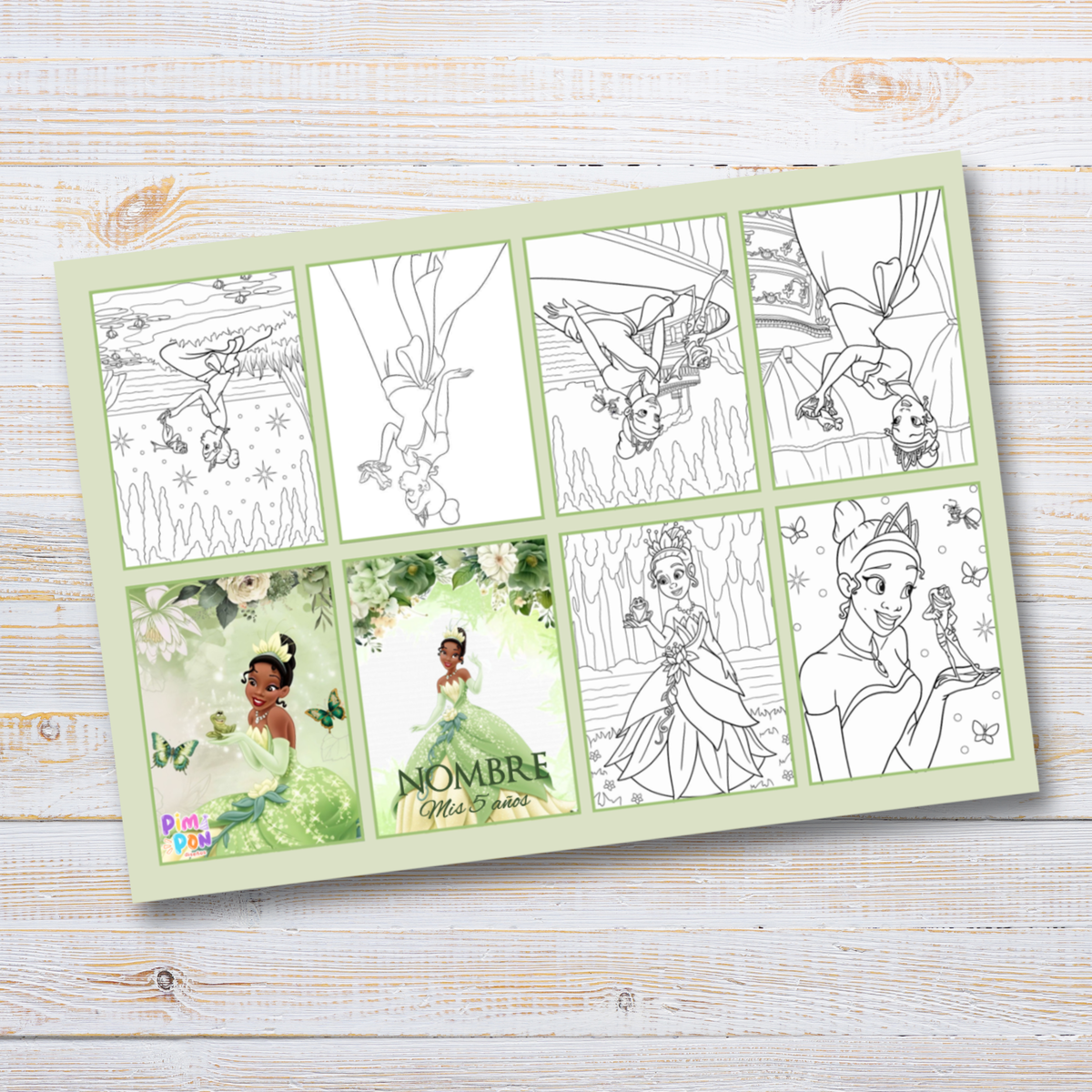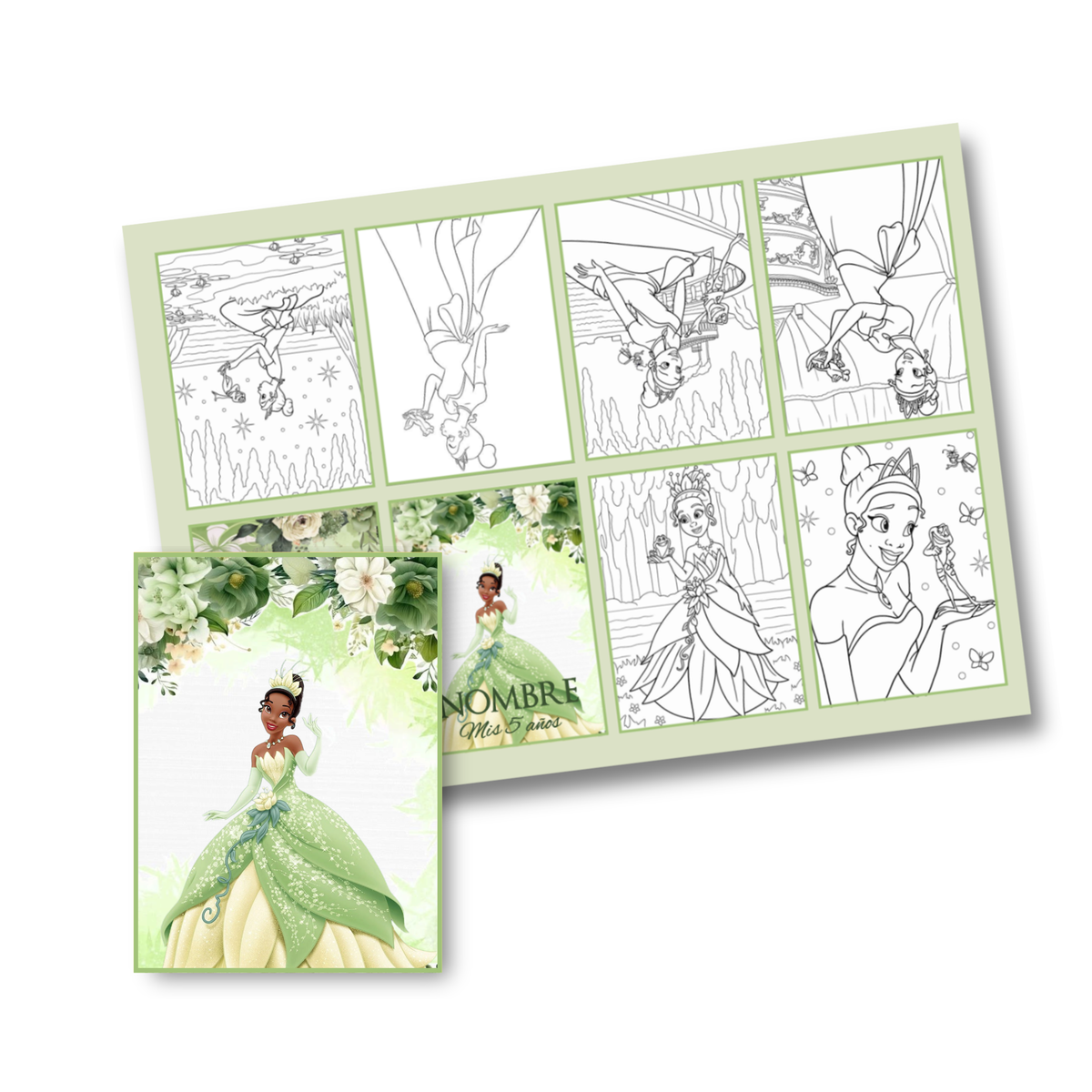Juego imprimible editable - souvenir - mini libro para colorear princesa tiana