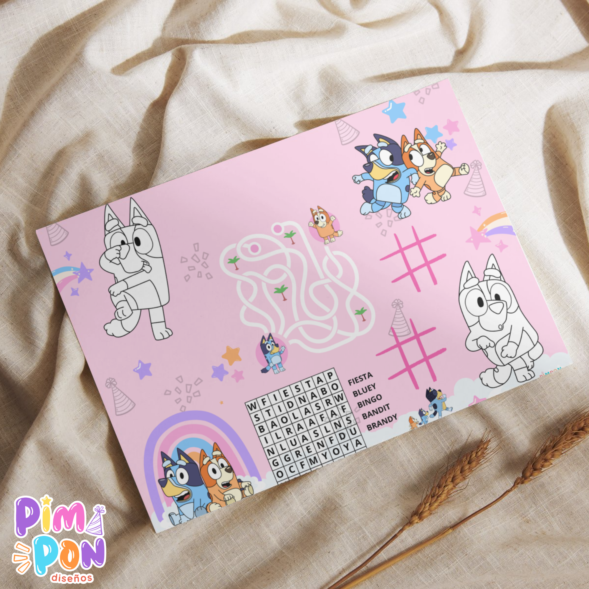 Juego imprimible - souvenir -mantel de actividades bluey rosa