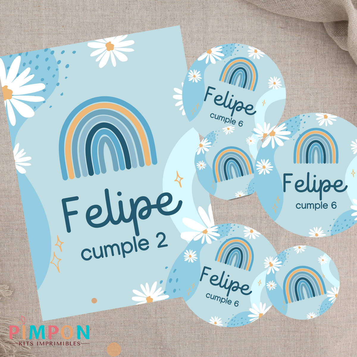 kit imprimible textos editables - ARCOIRIS Y MARGARITAS CELESTE
